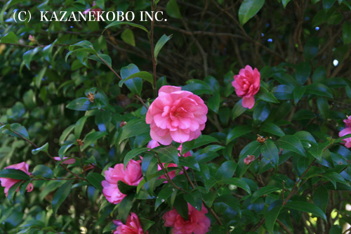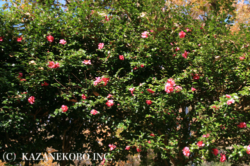山茶花の垣根が、だんだんと年輪を感じさせるように落ち着いてきた。 花もいっぱいついている。 下の木の門から大谷石の階段を昇って行くと、 この花たちが出迎えられている様だ。