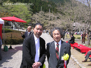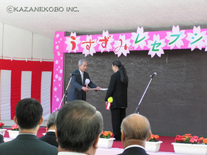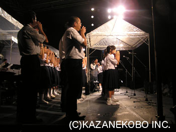 毎年恒例の宗次郎淡墨桜コンサートが今年も本巣市(旧根尾村)で行われました。 今回で14回目となる同コンサートには今年も大勢のお客様がご来場くださいました。例年同様??午前中は雨が降ったりやんだりとはっきりしない天気でしたが、15時の開場時間には晴れ間も覗く回復ぶり。そのままコンサート終了まで雨も降ることもなく無事に終了致しました。コンサートの模様を早速レポート。 (写真上から1枚目:コンサート全景) 根尾のコンサートは、夜空の中で、木々に囲まれたステージを美しくライトアップする照明もまた素晴らしいです。大自然の中で聴くオカリナの音色は格別です。 (2枚目:根尾中学生との共演風景) コンサートの見所のひとつ、根尾中学生との共演。今回は「根尾の夏風に吹かれて」、「Ocarina Wind Family」の2曲で共演しました。「Ocarina Wind Family」ではベースの役割をする低音のC管も参加しての6声でのアンサンブル。みんなうまい! (3枚目:根尾中学生お礼の挨拶) アンコール部で代表の生徒二人によるお礼の挨拶。しっかりとした挨拶でコンサートの最後を引き締めてくれました。 (4枚目:『本巣市文化交流大使』委嘱式) また、アンコール時には『本巣市文化交流大使』委嘱式が行われました。本巣市長より宗次郎に『本巣市文化交流大使』委嘱状が手渡されました。本巣市の文化面での発展に宗次郎も全面的に協力させて頂きます!