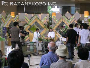 京都駅ビル室町小路広場で、『いけばな嵯峨御流「日本をいける」プロジェクト』と題し、宗次郎のオカリナと嵯峨御流の光岡先生の生け花のコラボレーション・コンサートが行われました。「Cosmos Children」を奏でるオカリナの音色に乗って、エネルギッシュに色とりどりの花がいけられていく様子はとても躍動的でしたよ。 会場にはとても大勢のお客様にご来場頂きました。ありがとうございました。